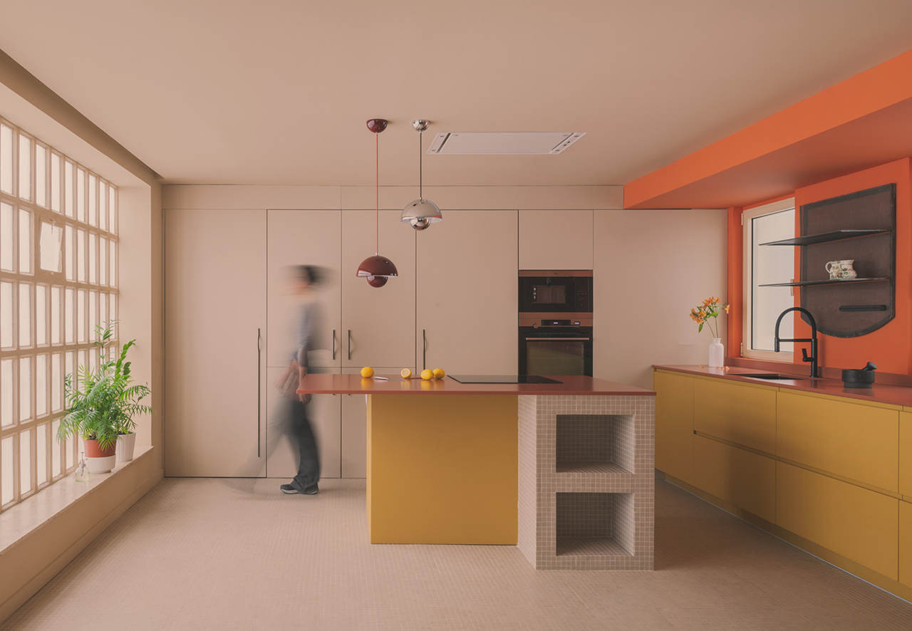 The structure of concrete pillars and beams is uncovered, the enclosures of paving pieces and the dark finishes of the period are restored. Instead of replacing them, they are integrated into a now open-plan space that pivots between two focal points: an island with a mustard base and a ceramic base, and on the other side an orange wooden body that focuses attention on the centre of the living room.